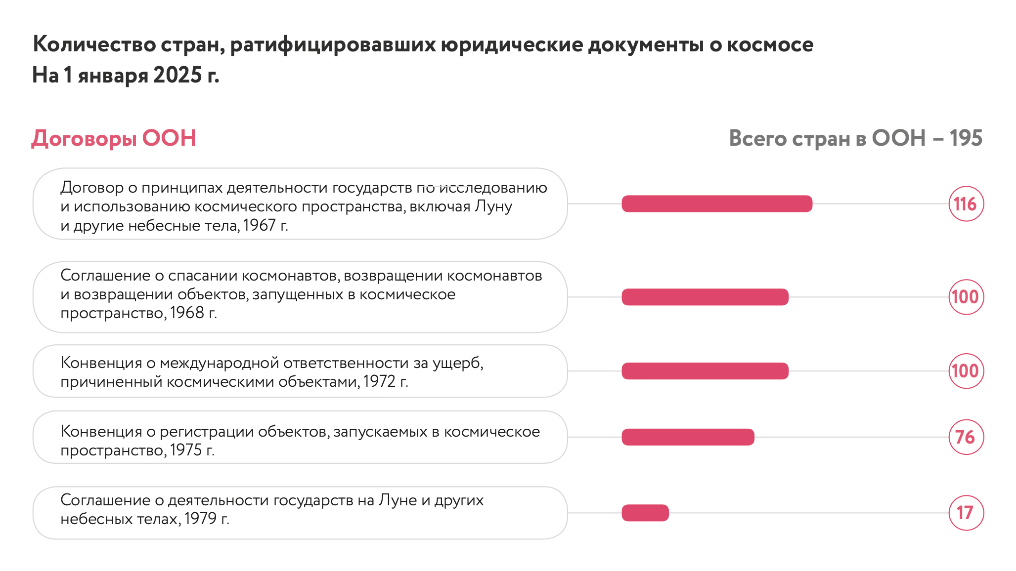 Международное регулирование не успевает за технологическим развитием. Последнее всеобъемлющее соглашение под эгидой ООН (Соглашение о деятельности государств на Луне и других небесных телах) было открыто для подписания в 1979 г., но его ратифицировали лишь 17 государств, и среди них нет ни одной ведущей космической державы.